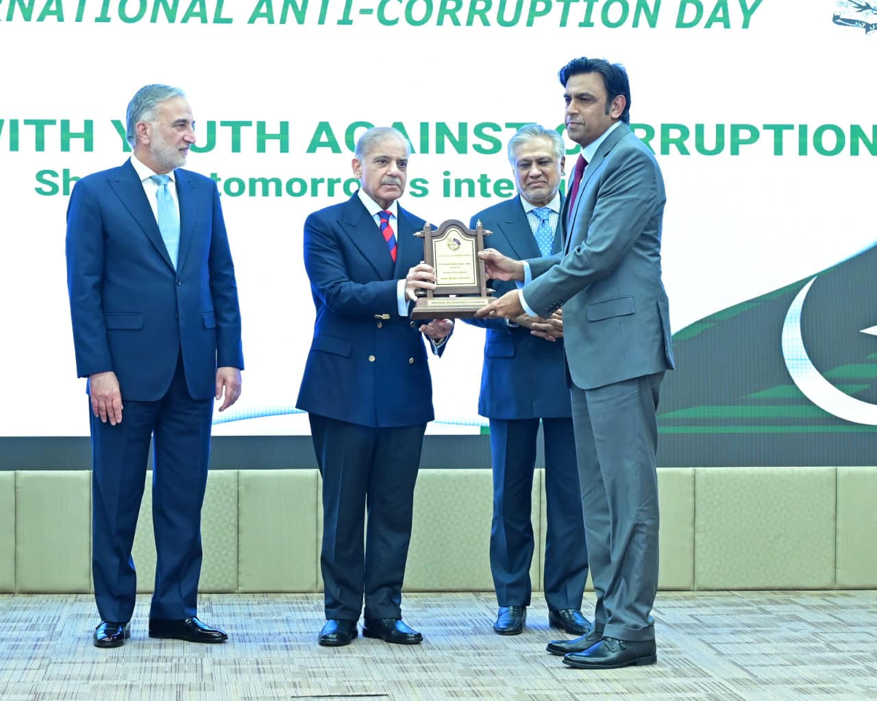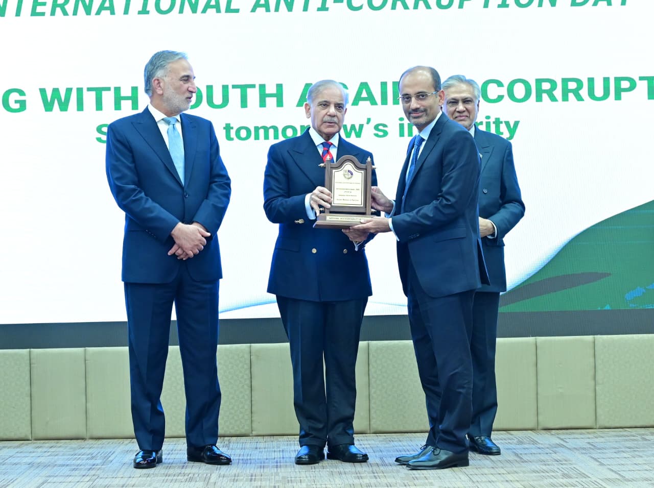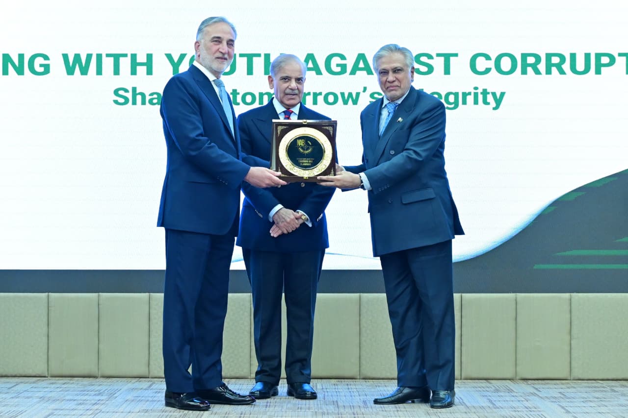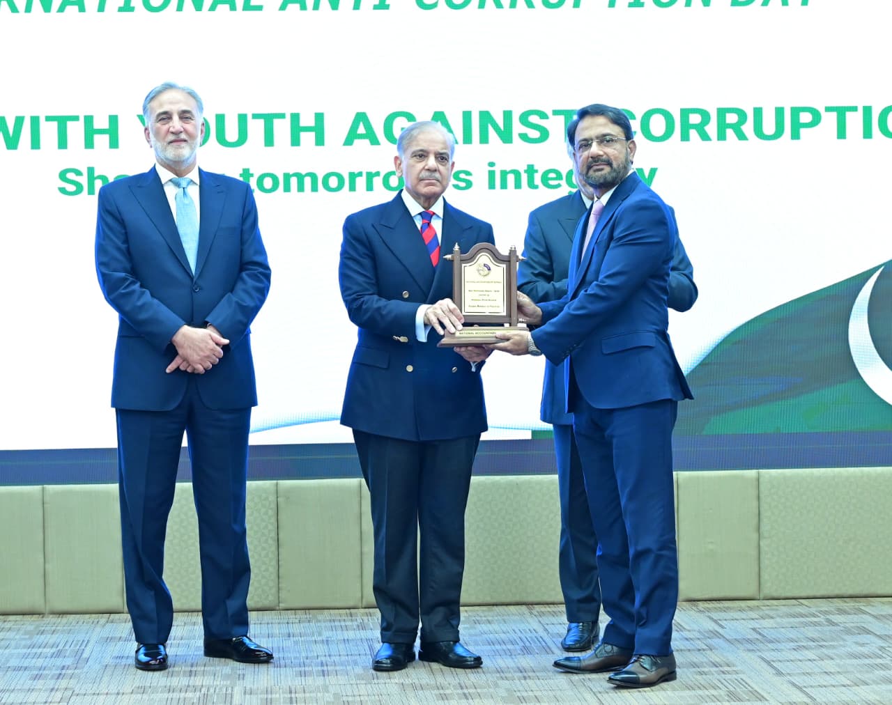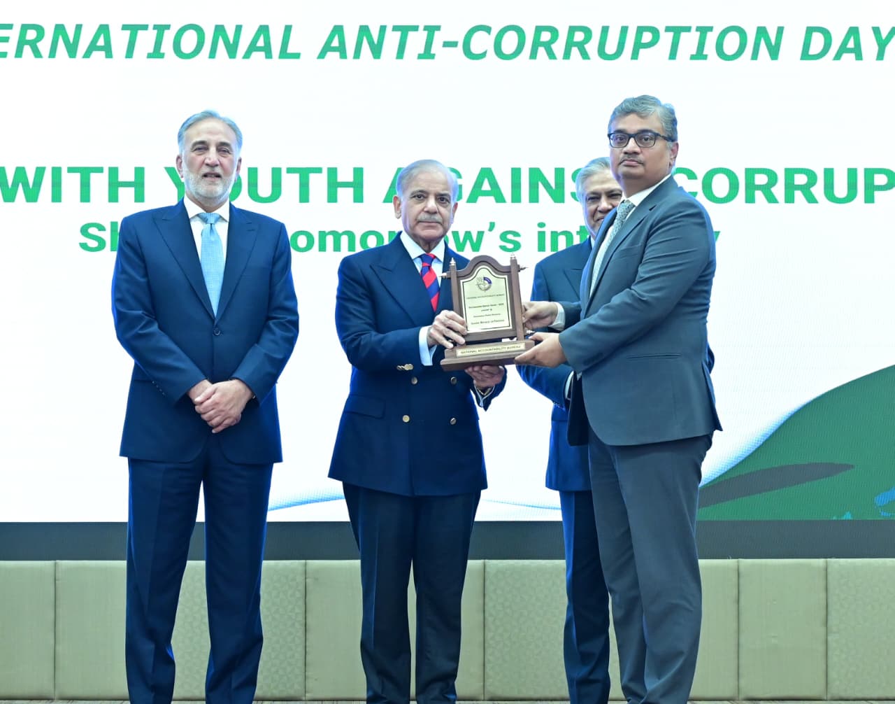 Chairman NAB giving shield to PM Muhammad Shehbaz Sharif at International Anti-Corruption Day ceremony on 9th December 2025