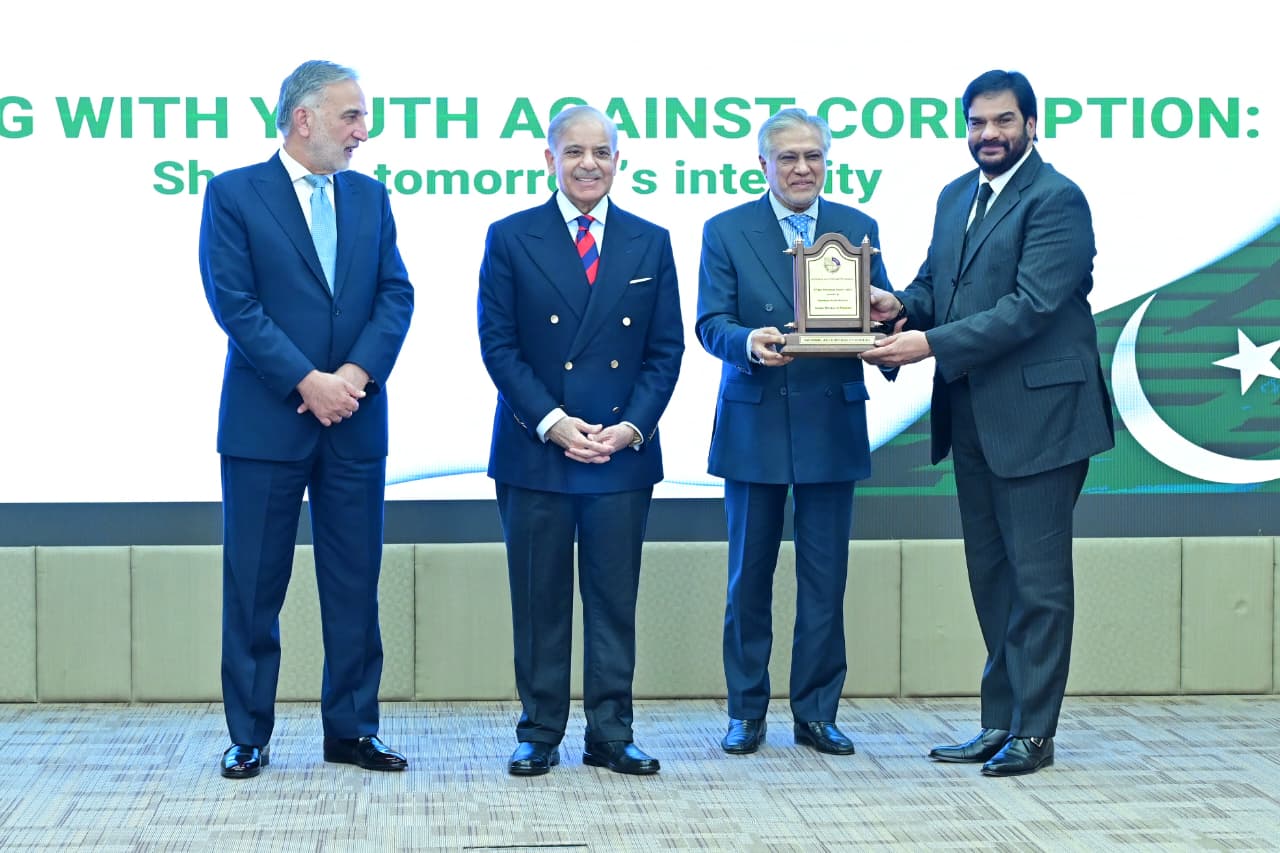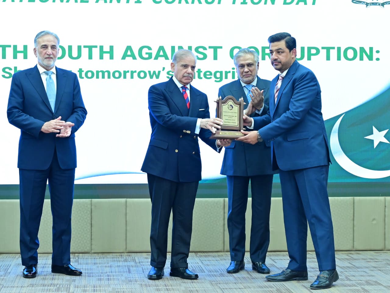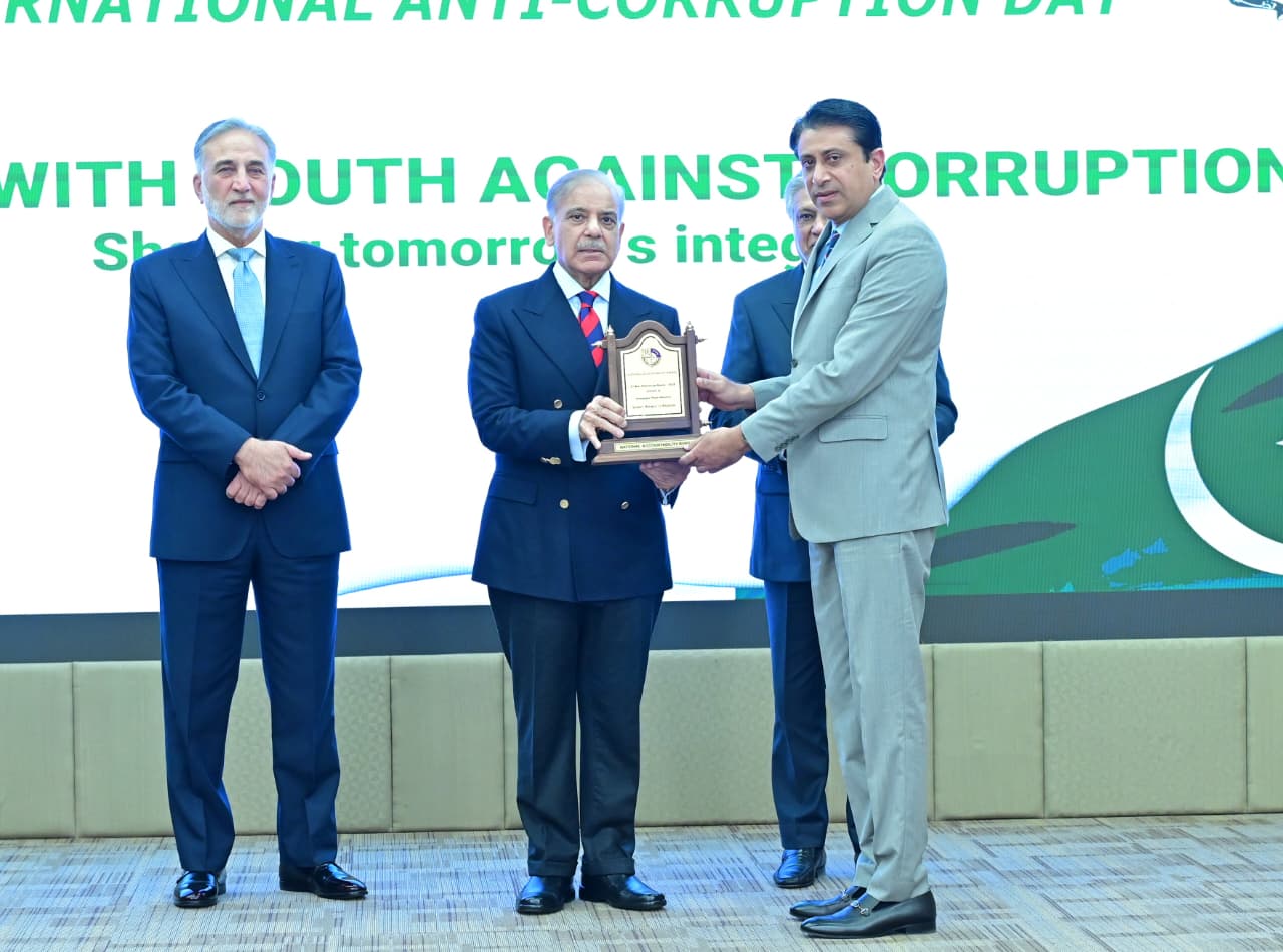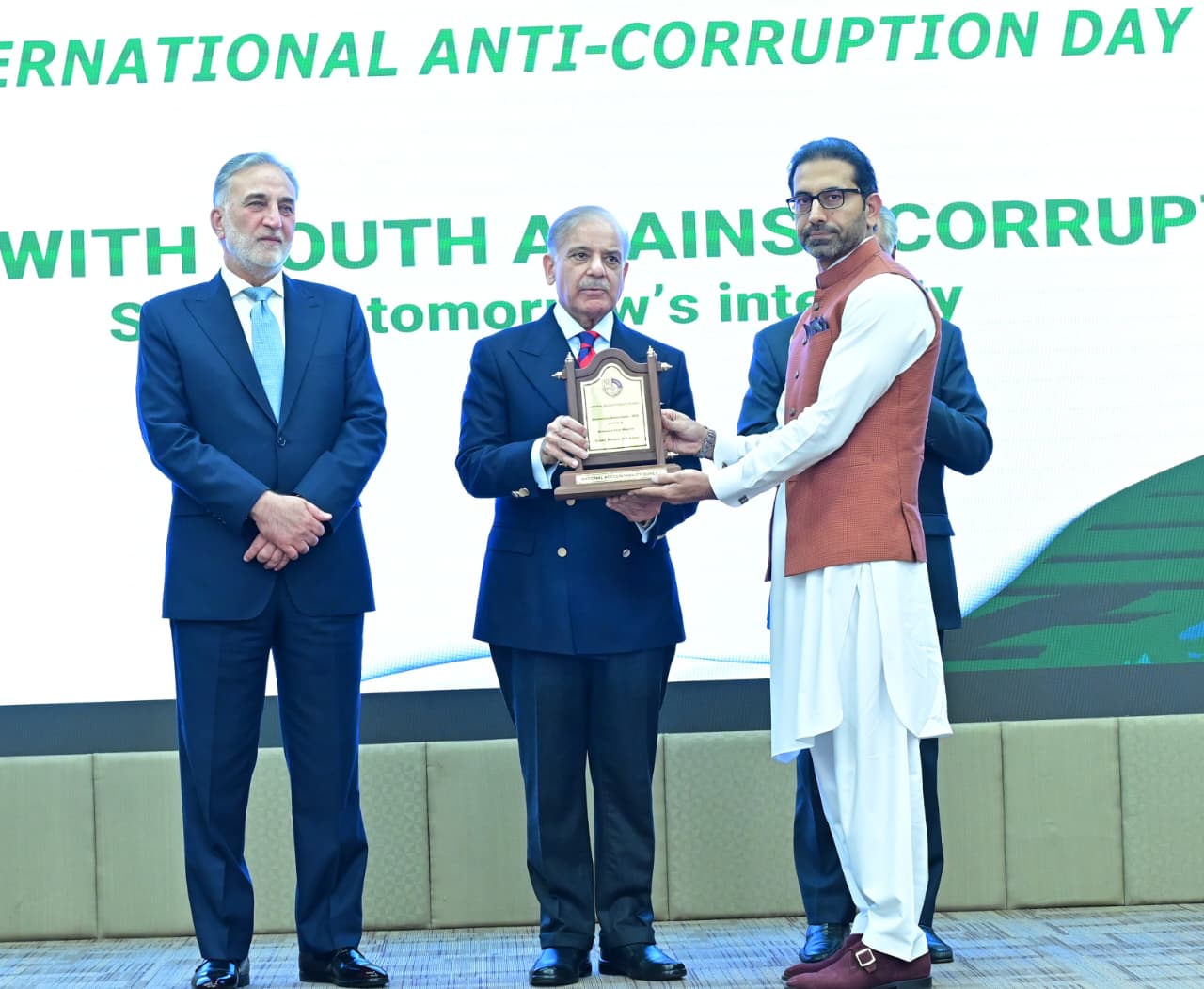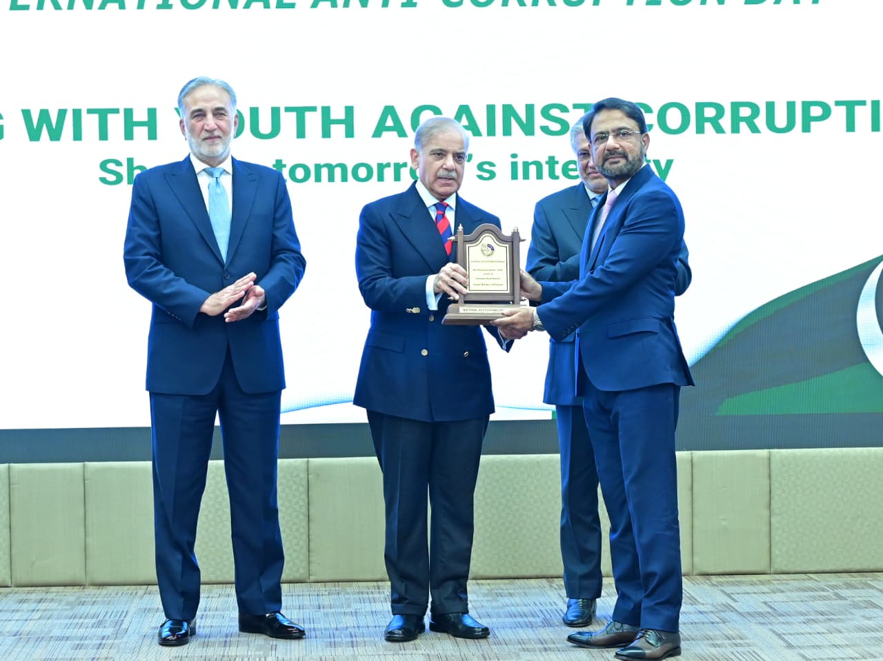 Chairman NAB giving shield to PM Muhammad Shehbaz Sharif at International Anti-Corruption Day ceremony on 9th December 2025