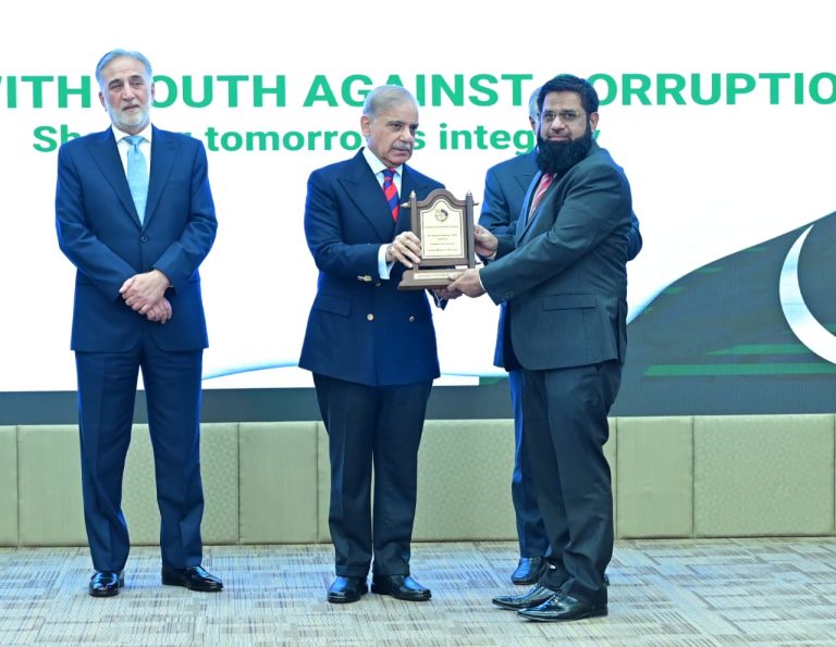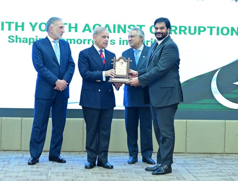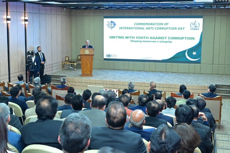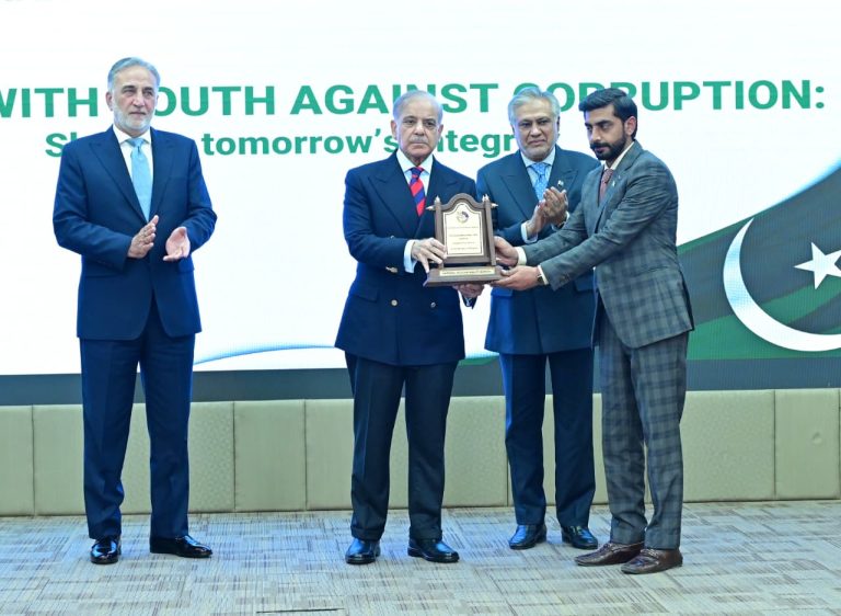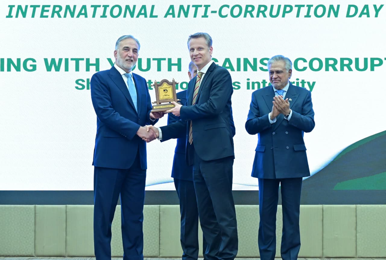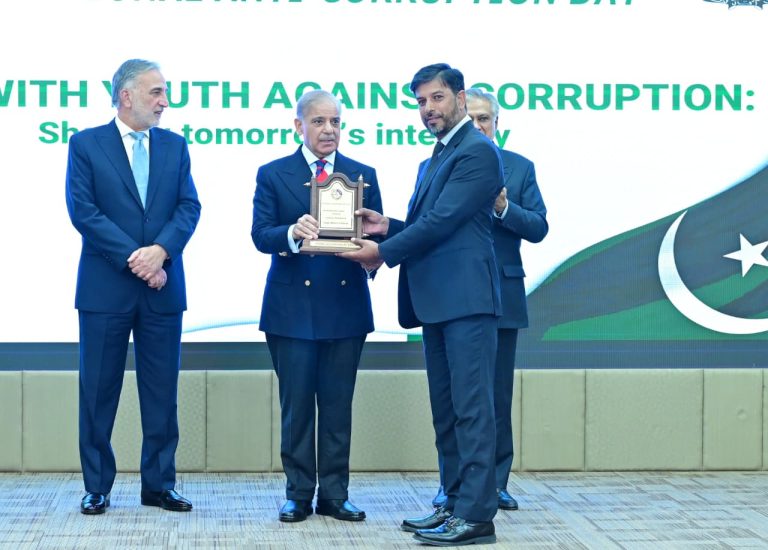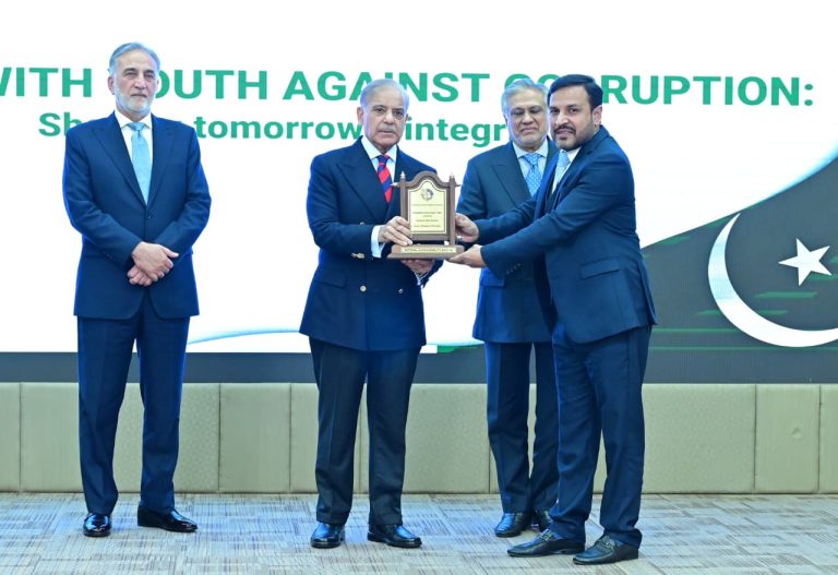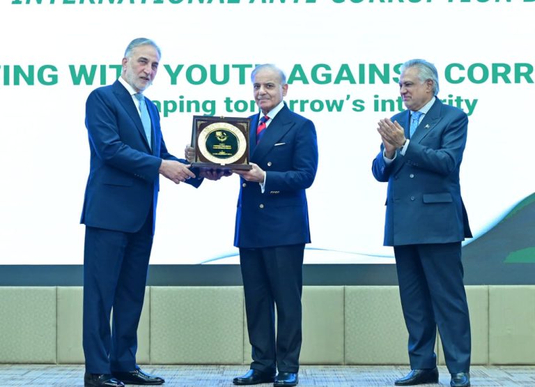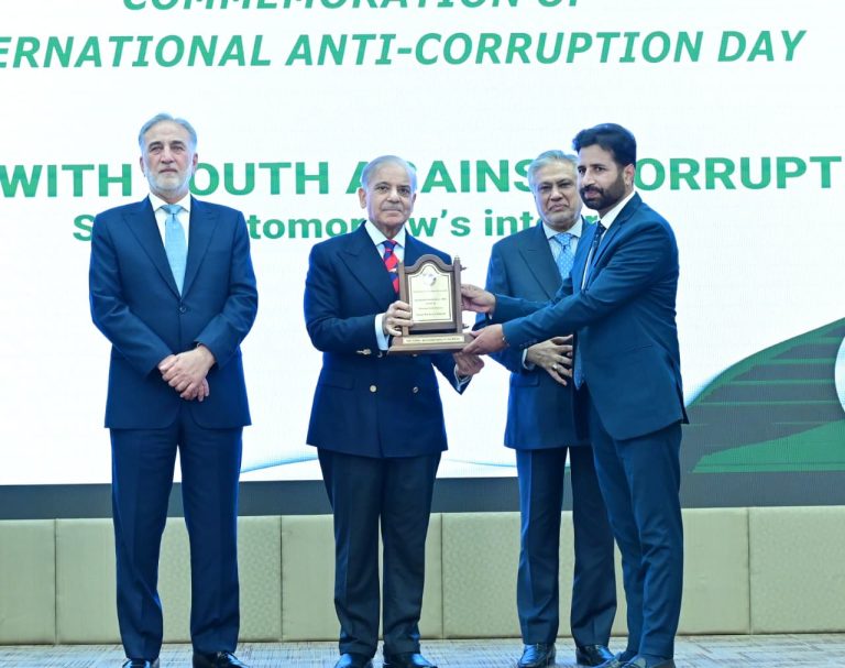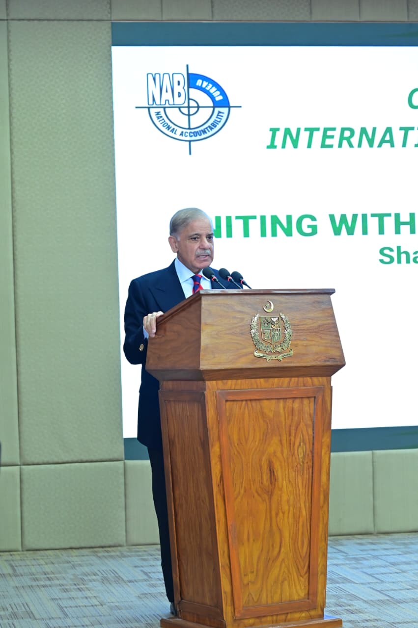 Chairman NAB giving shield to PM Muhammad Shehbaz Sharif at International Anti-Corruption Day ceremony on 9th December 2025